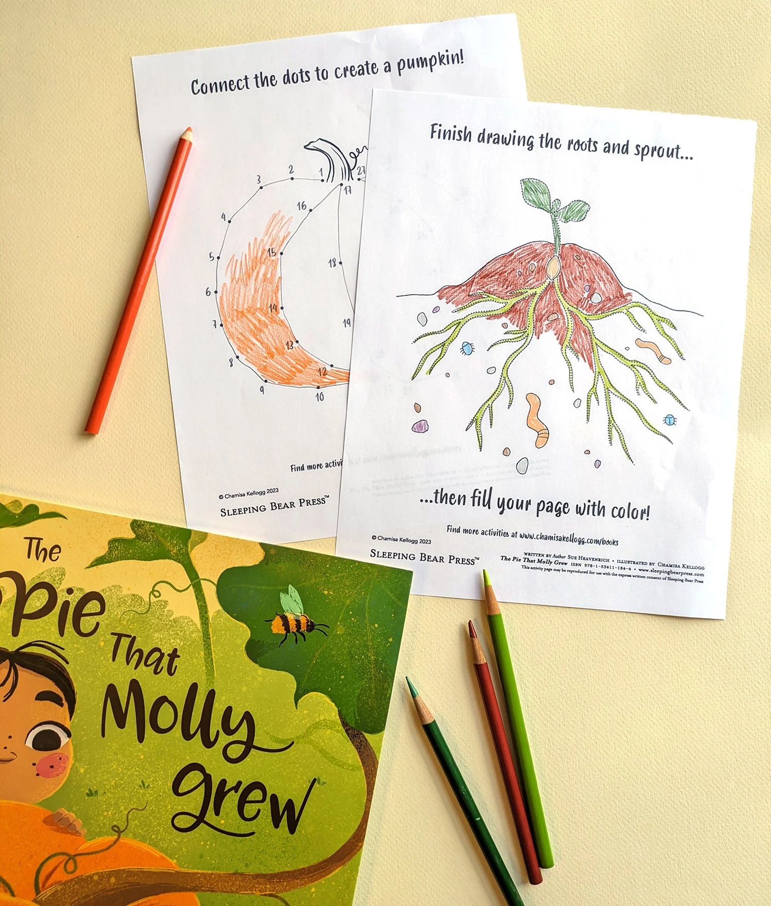 Fun activities to pair with my book The Pie that Molly Grew. The printable PDF features a dot-to-dot page and a coloring page.